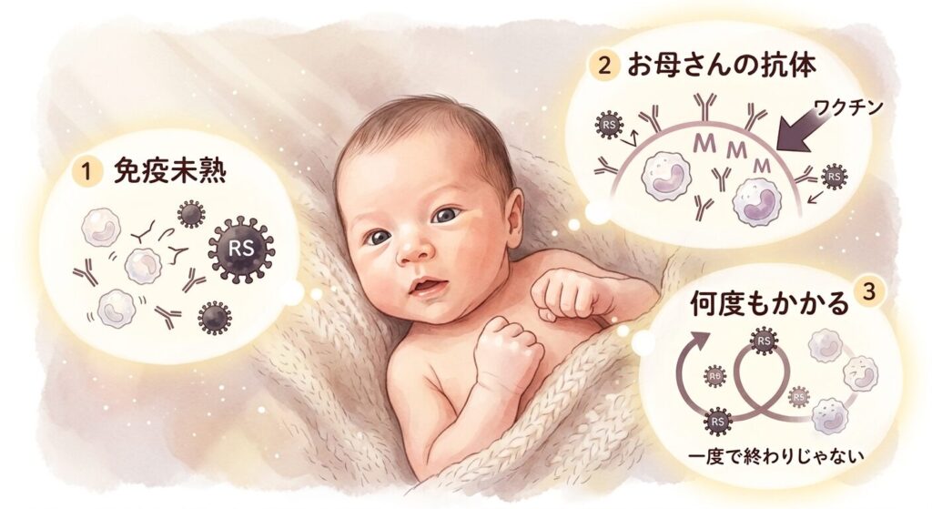 RSウイルスが最も怖いのは、生後6か月未満の小さなお子さんです。しかし、この時期の赤ちゃんへのワクチン接種には3つの壁がありました。