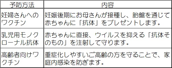 現在は、お母さんを通じた免疫や、最新の抗体製剤によって、赤ちゃんを安全に守る環境が整いつつあります。次のエントリーでは、今年4月から定期接種となる「母子免疫ワクチン」についてお伝えしたいと思います。