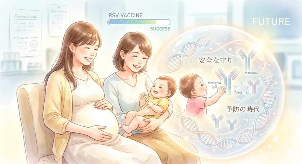 「アブリスボ」は、お母さんが妊娠中に接種することで、お腹の赤ちゃんに免疫(抗体)をプレゼントし、生まれた後の重症化を防ぐ画期的なワクチン(母子免疫ワクチン)です。今年の4月から定期接種となり、公費による接種が可能です。