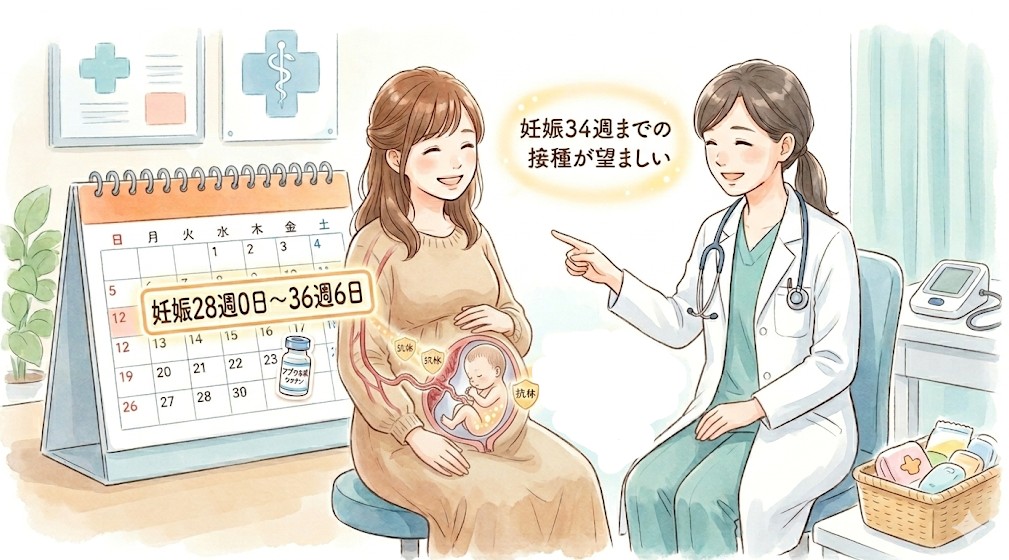お母さんの体で作られた抗体が赤ちゃんにしっかり移行するまでには、約2週間かかります。そのため、出産の2週間前までには接種を済ませておくのが理想的です。妊娠37週に入るといつ生まれても不思議ではないので、できれば妊娠34週までに接種することが望ましいと言えます。