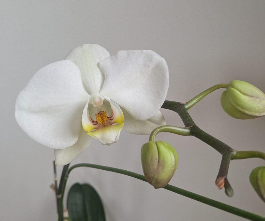 葉は、1枚ずつ枯れては、新たな葉が出てきてくれます。花を咲かせた後の茎は、一旦成長がストップした後、年が明けたころから伸び始めます。枯れてしまうこともありますが、その時は新たな茎が根元から伸び始めます。植え替えは、2年目か3年目の一度だけ。肥料も与えていません。ほんとうに、生命力の強さに感心します。