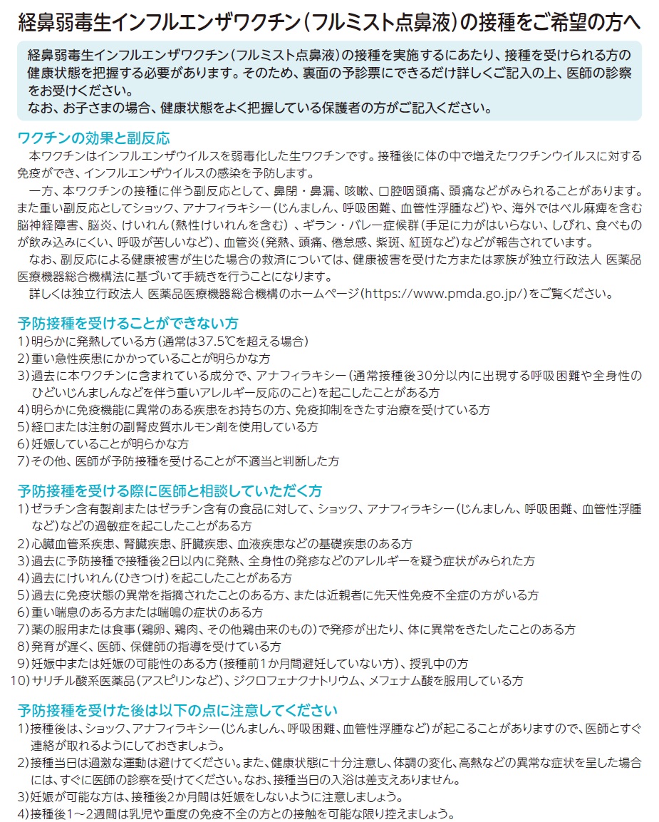 - 費用は、インフルエンザワクチンは1回3,500円(消費税込)、フルミストは1回7,000円(消費税込)になります。